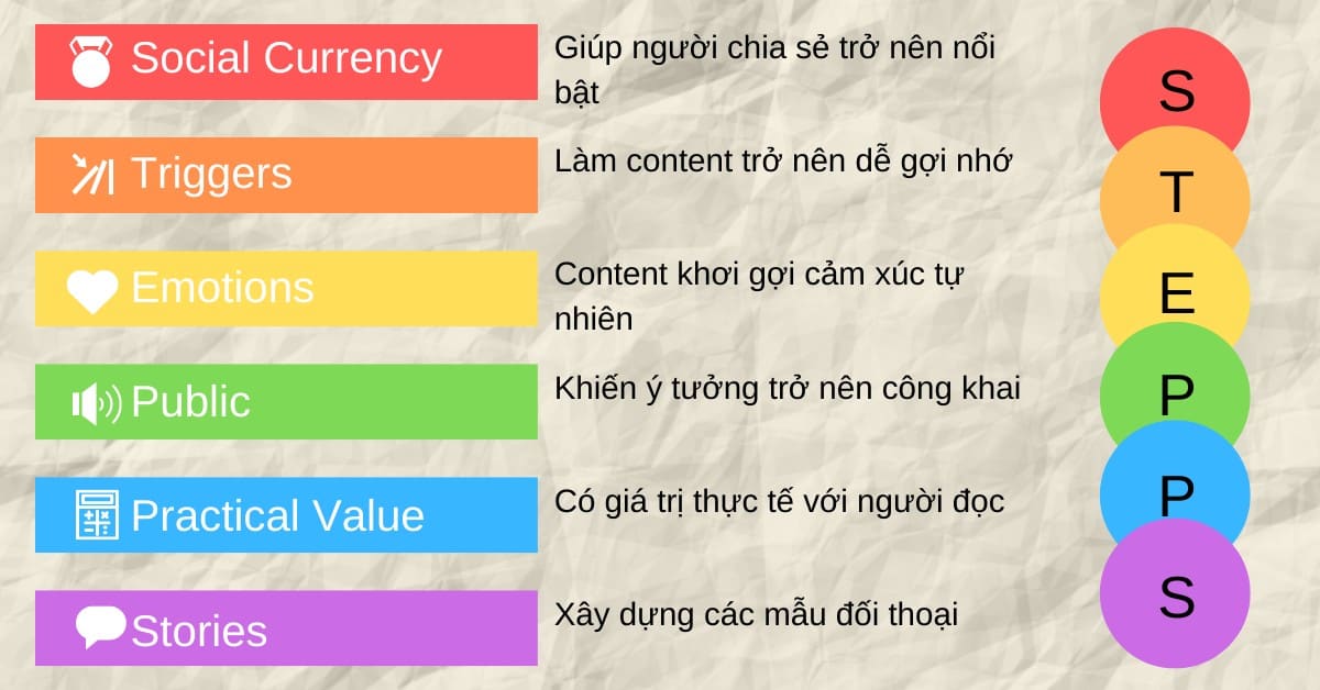 Để 1 nội dung/ý tưởng/sản phẩm trở nên viral thì phải thoả ít nhất 1 trong 6 yếu tố của Stepps framework.